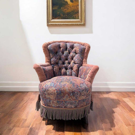 Antique Tufted Rocking Chair – Custom Upholstered Victorian Accent Chair with Fringe Trim & Floral Velvet Fabric