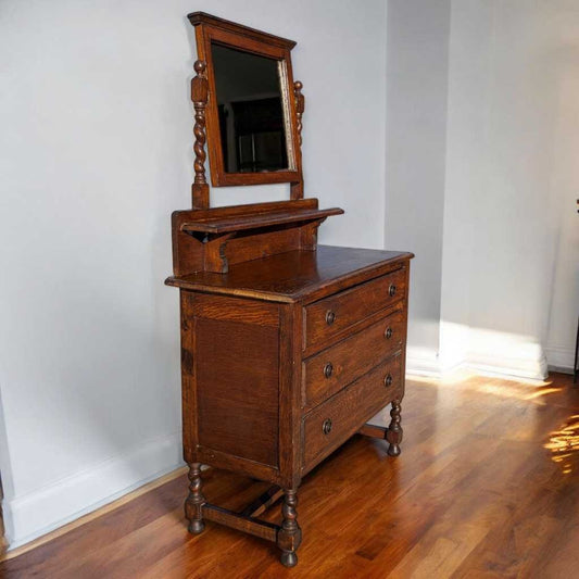 Antique Tiger Oak Dresser with Mirror – Barley Twist Detail, Vintage Vanity with Drawers, Early 1900s