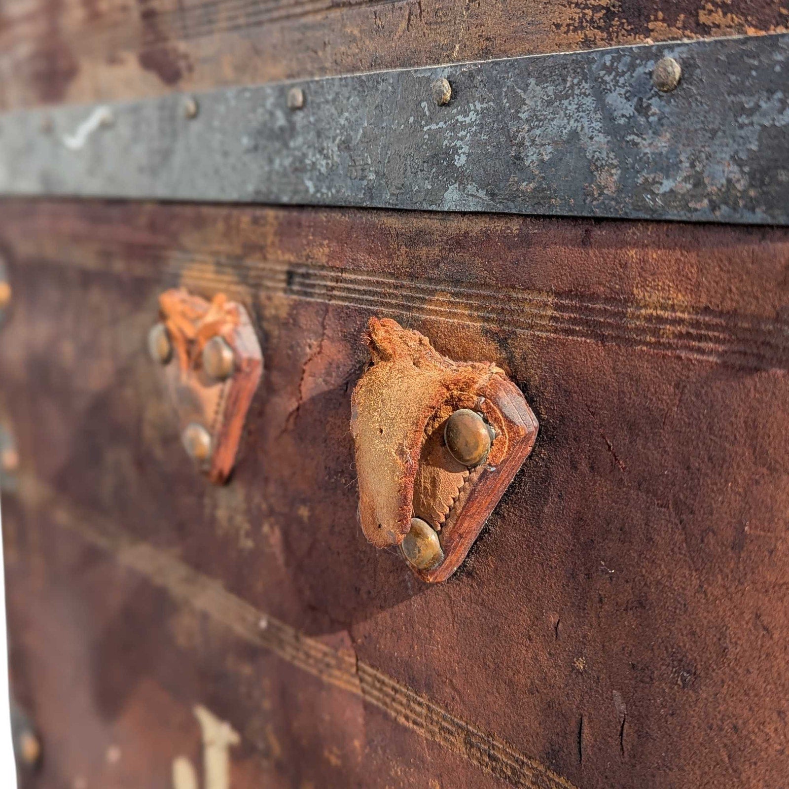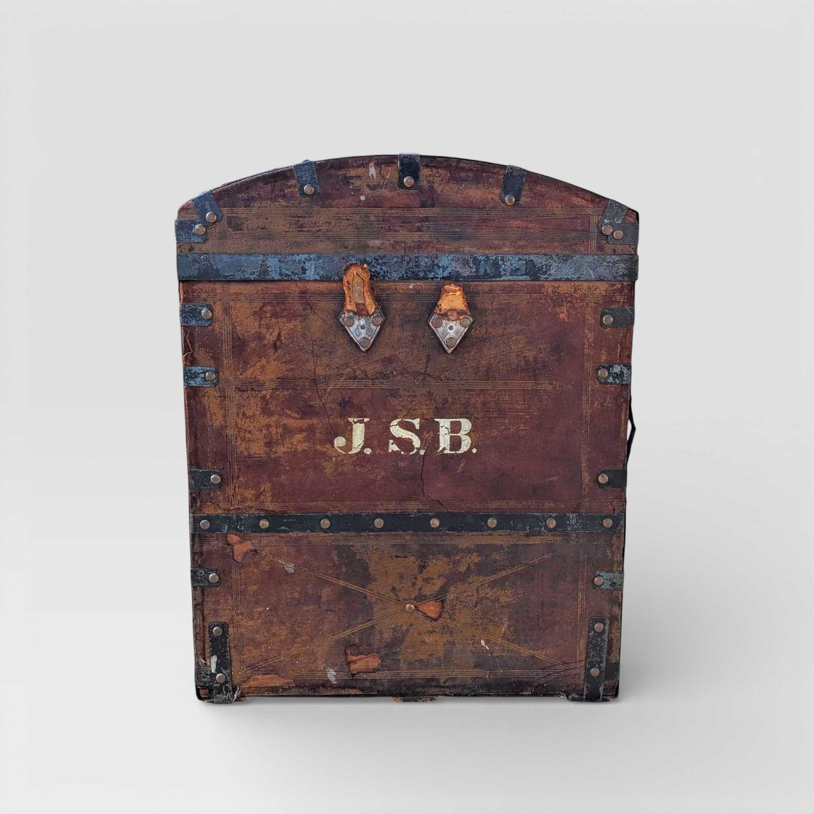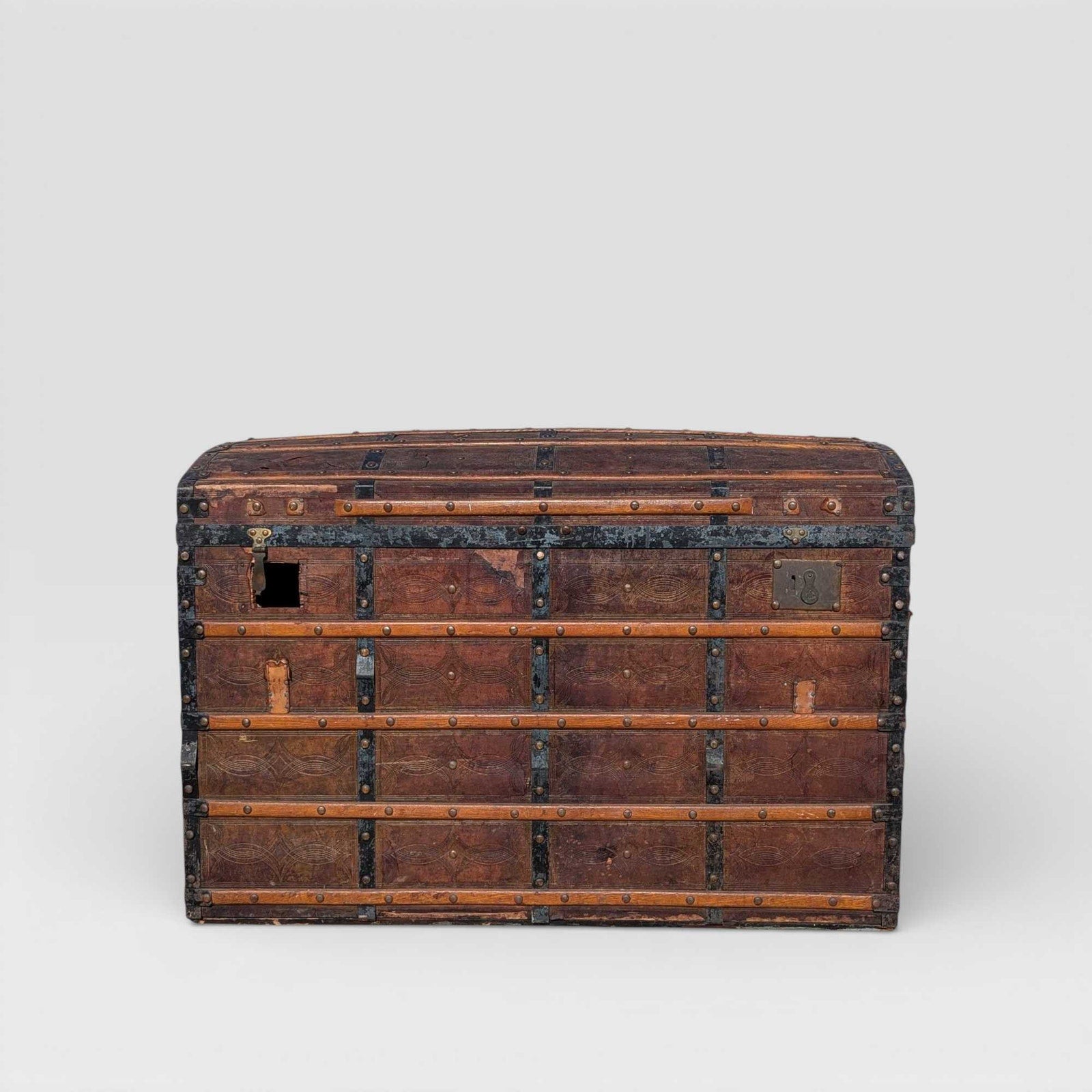 This striking antique dome-top wooden trunk is rich with history, texture, and visual presence. Substantial in scale and layered with decades of wear, it offers the kind of patina that can’t be replicated—only earned through time and use.