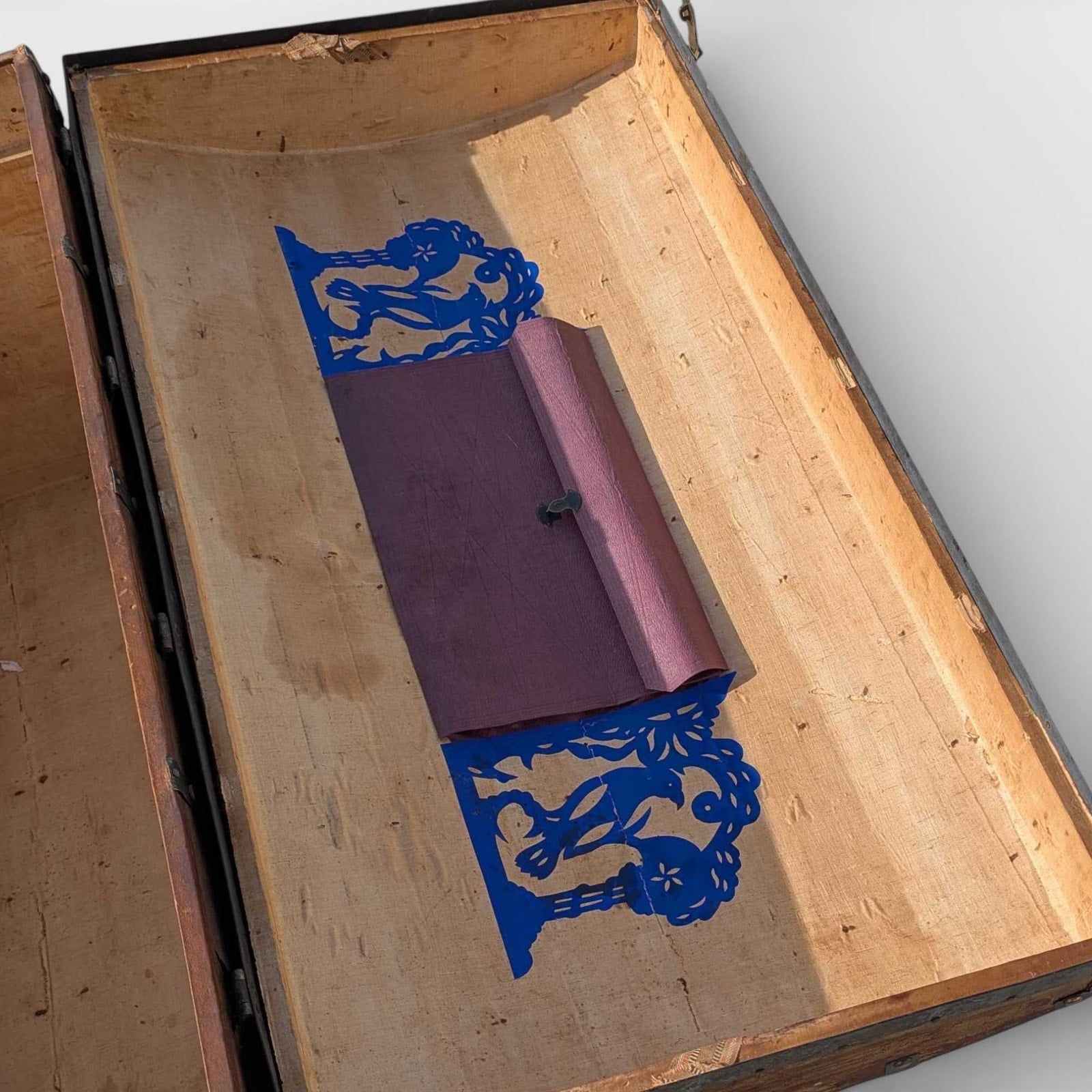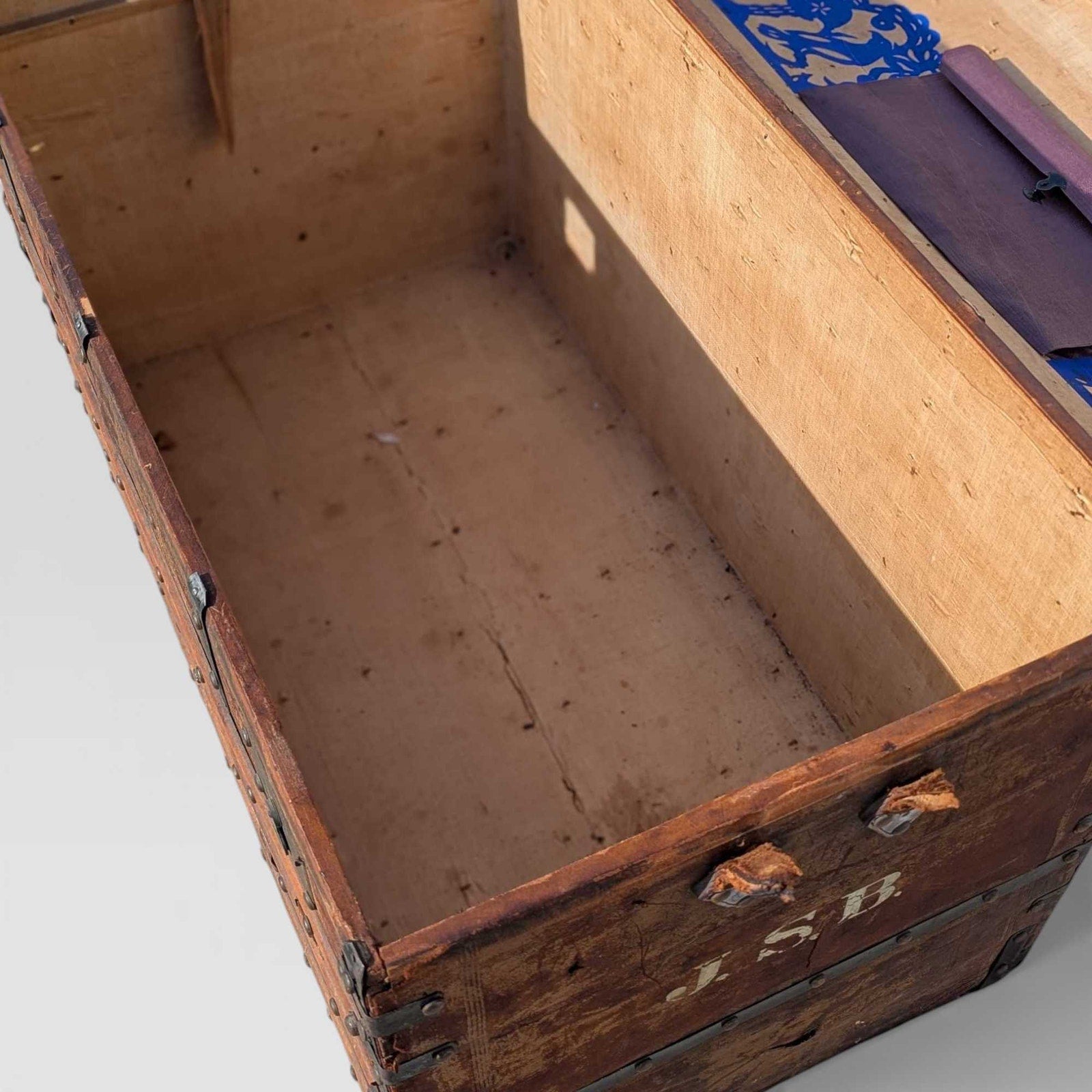 The hinged lid opens and closes properly and reveals an interior lined with aged linen or canvas material, consistent with period trunk construction. The original lock hardware is present, though one lock is missing. The trunk does not currently lock.