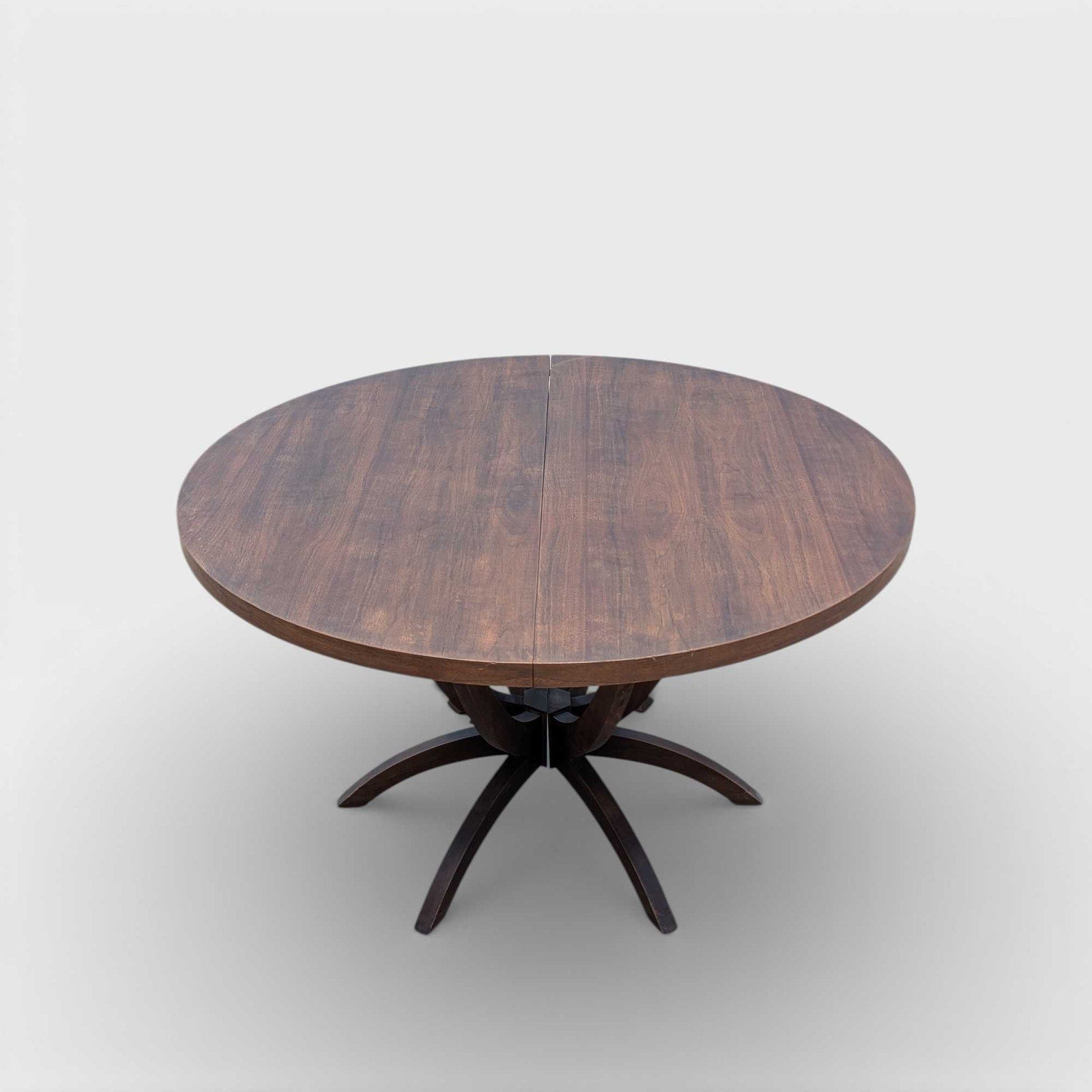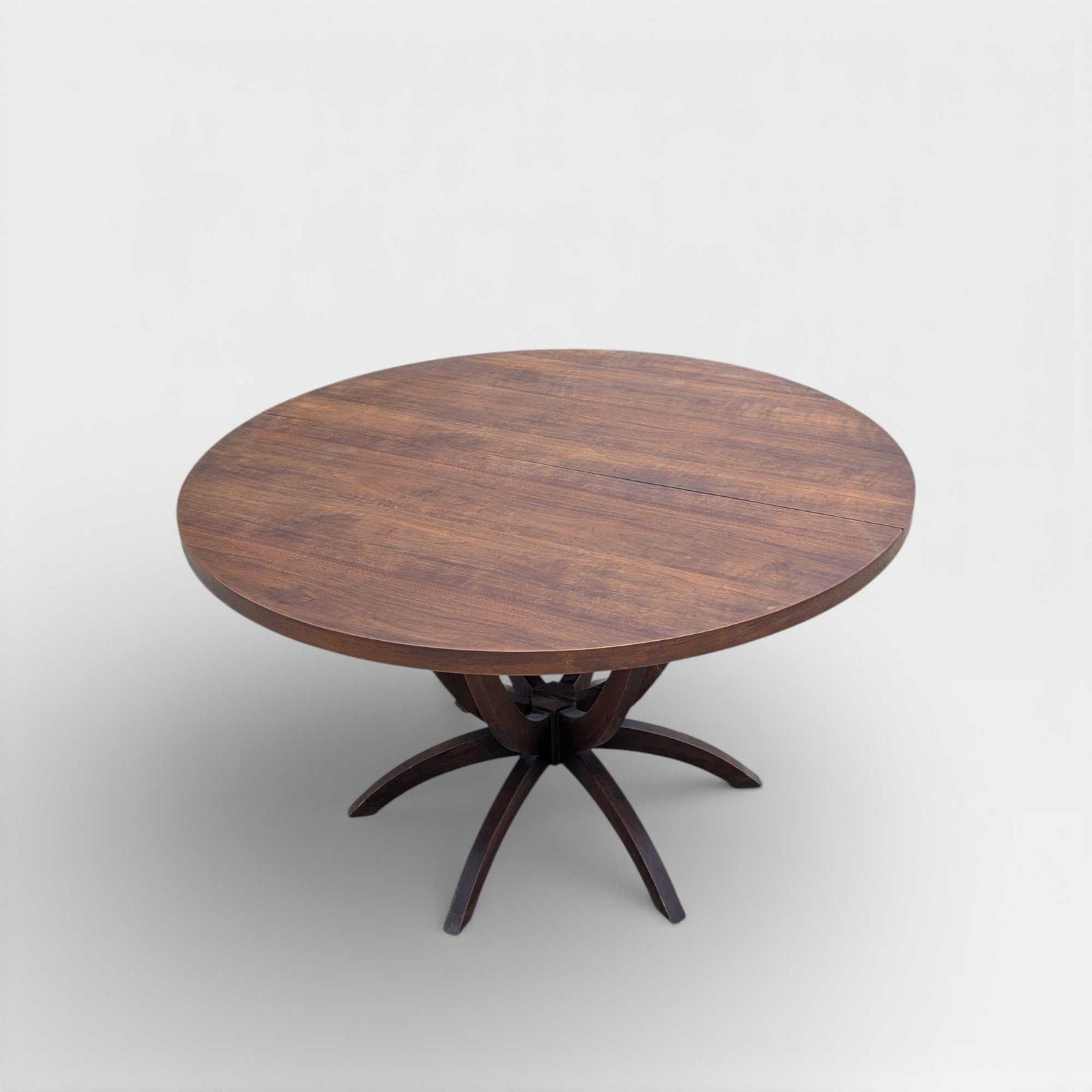 A striking Mid-Century Modern round dining table attributed to Chet Beardsley for Living Designs, showcasing a beautifully sculptural pedestal base and rich wood grain throughout. This piece embodies classic American MCM craftsmanship, with balanced proportions and an architectural base that feels both light and substantial.