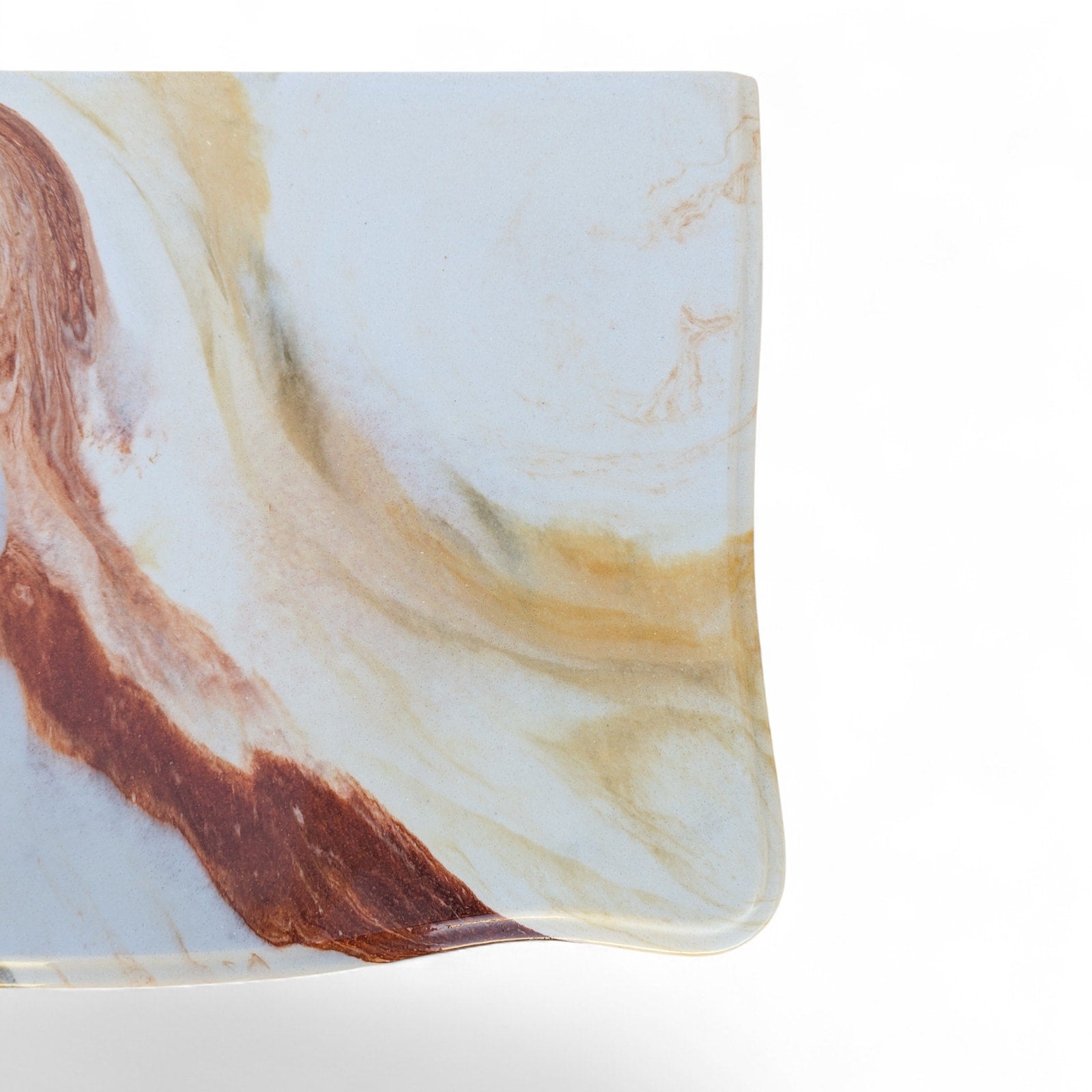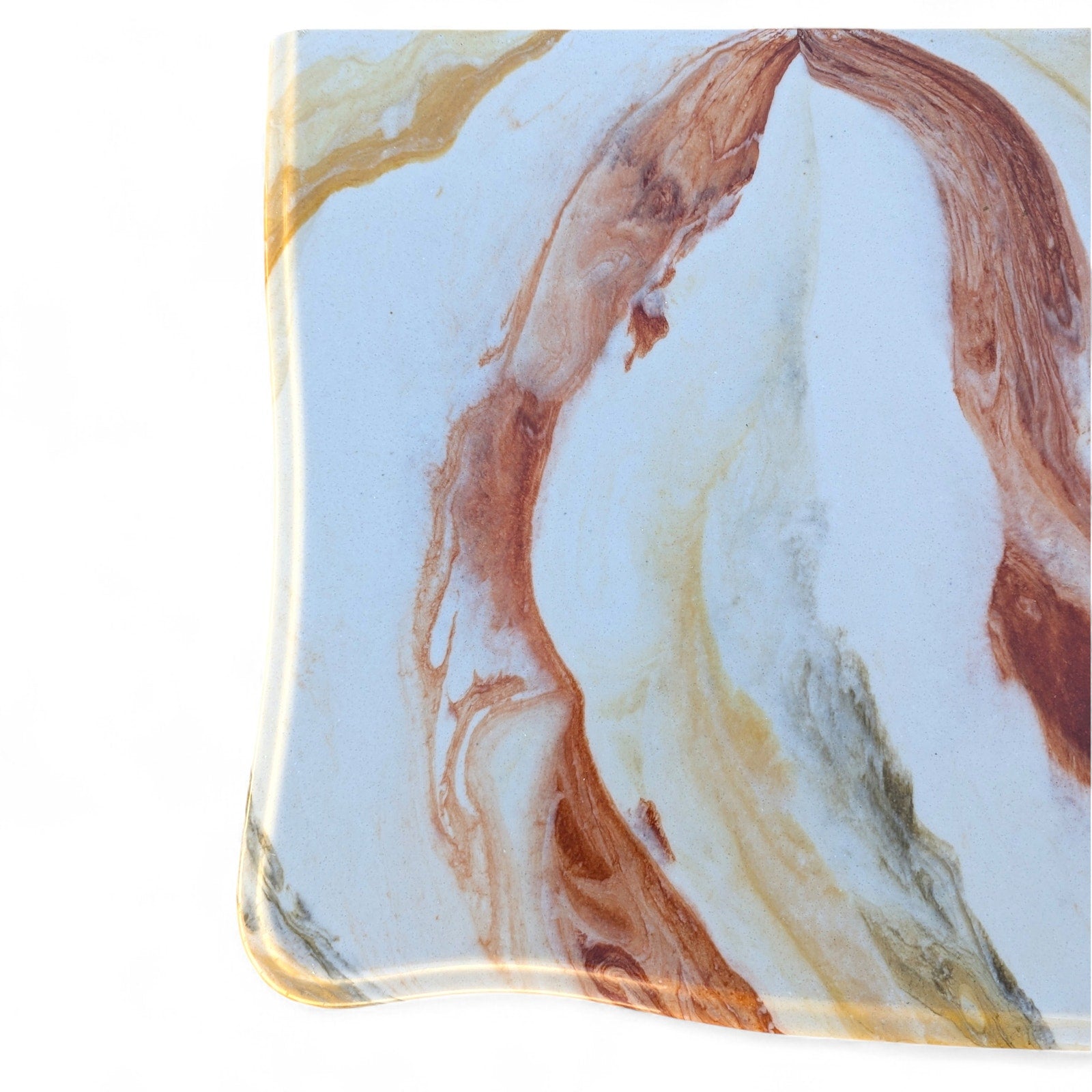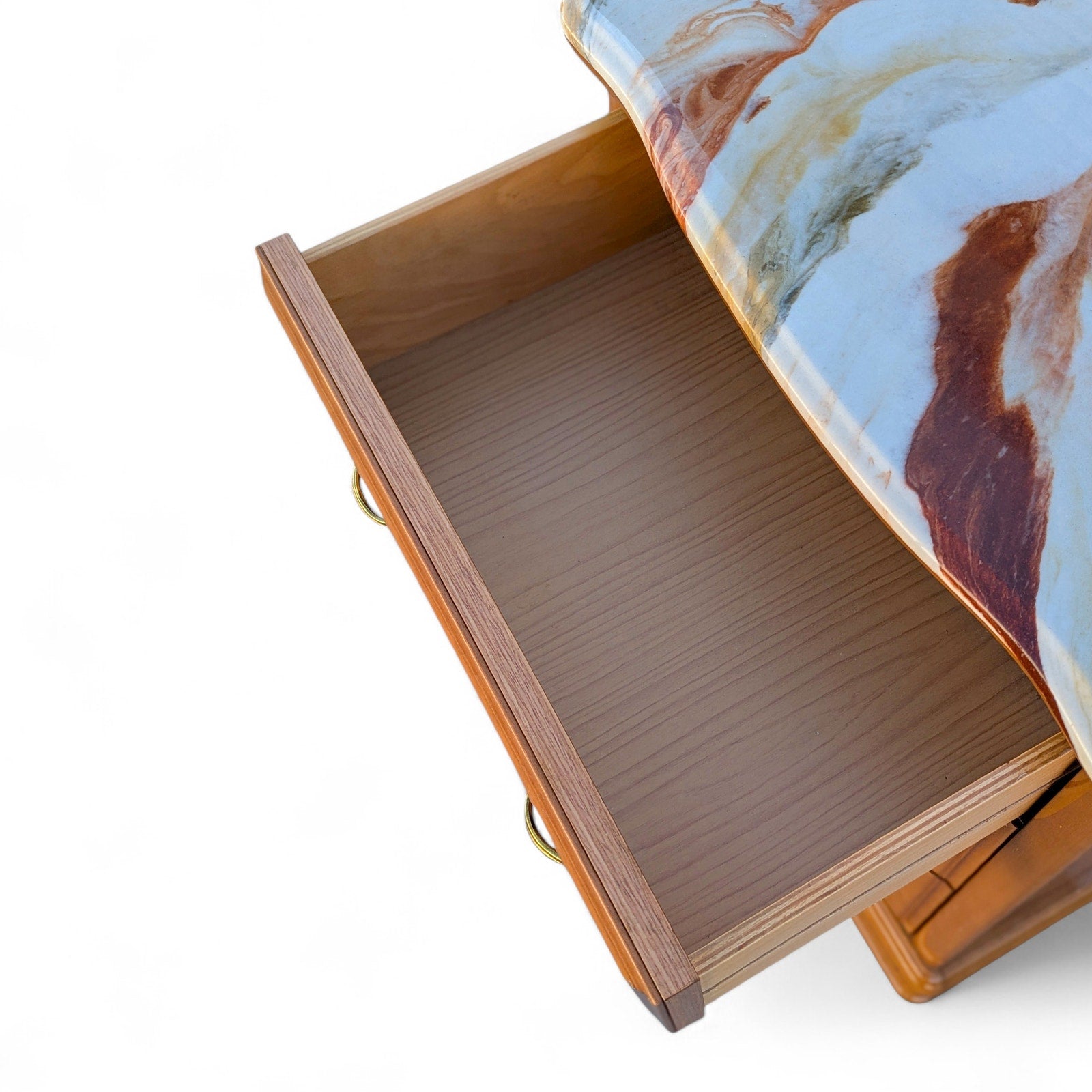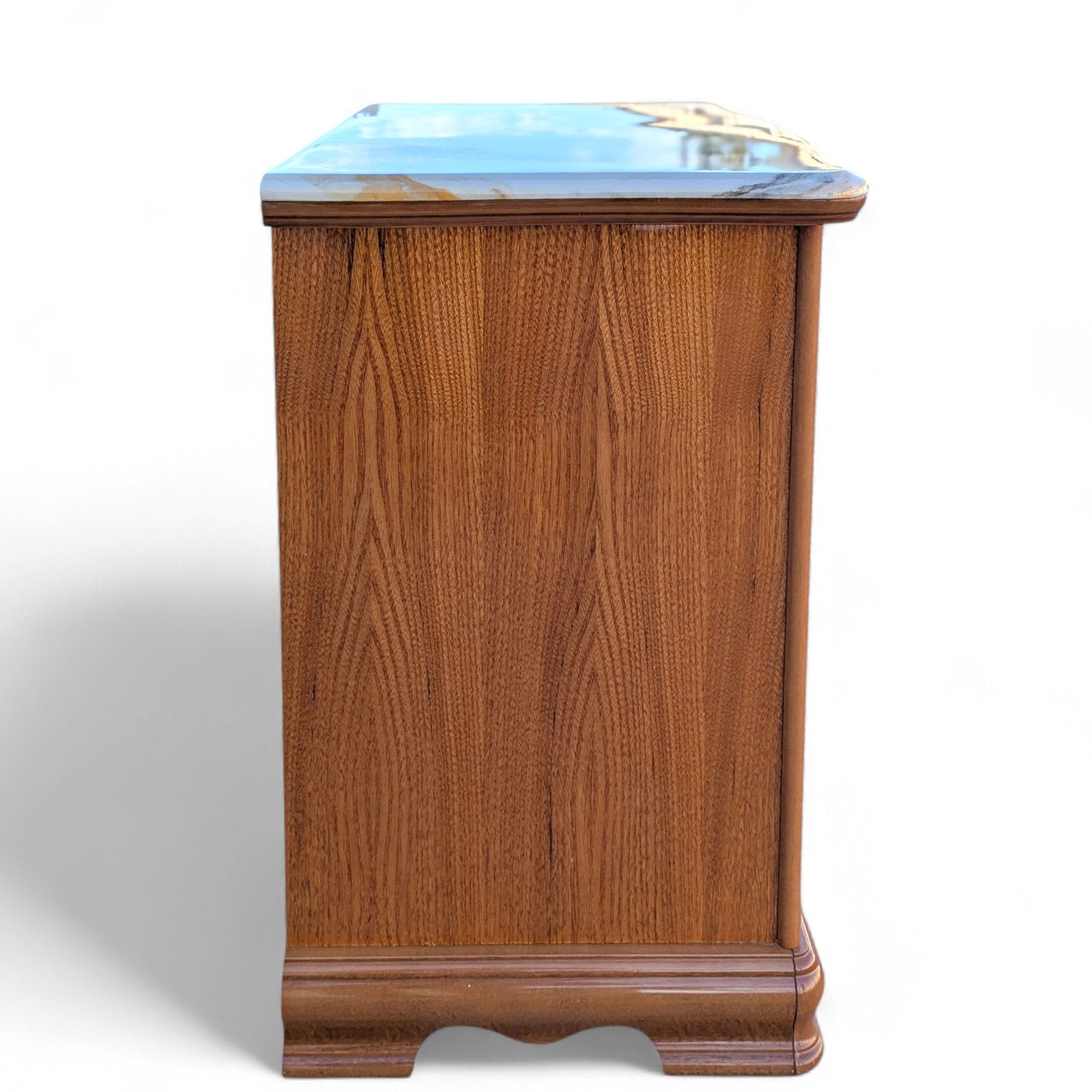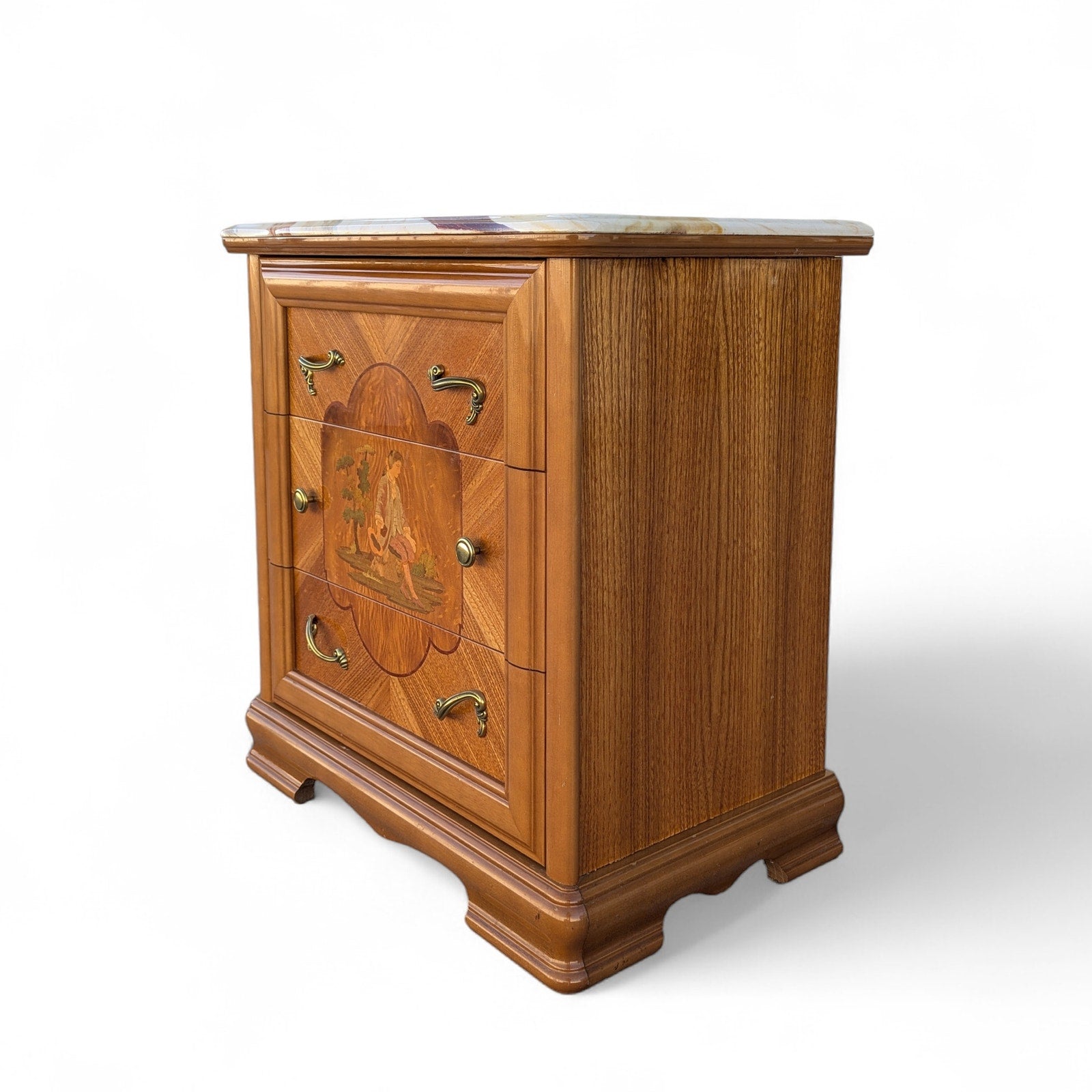 The nightstand is topped with a contoured faux marble composite surface featuring bold veining. While not natural stone, the fabricated top reflects popular decorative furniture trends of the 1970s–1980s and offers durability suitable for everyday bedside use. Traditional design details include brass-finished scroll hardware, bracket-style feet, and a gently shaped case.