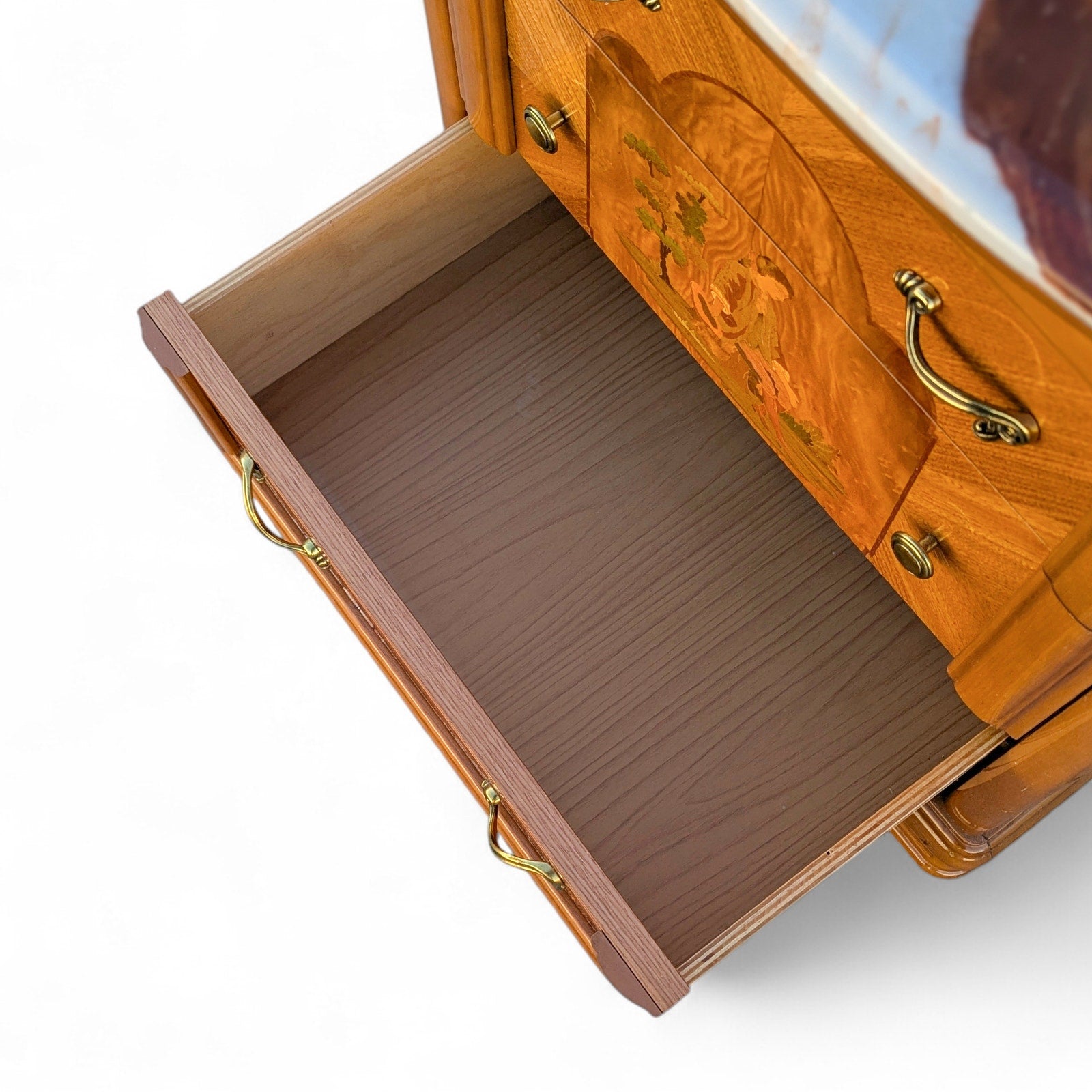 Features: Three drawers, curved front, floral inlay, brass-finished hardware