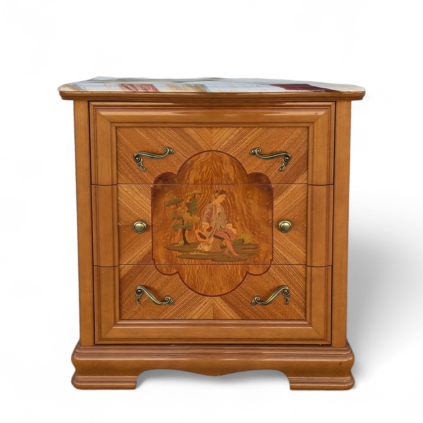 This European-inspired three-drawer nightstand is a decorative vintage piece from the late 20th century, designed in a revival style that references classical European furniture forms. The curved front is accented with a stylized floral inlay, framed by book-matched wood veneers that add warmth and visual depth.