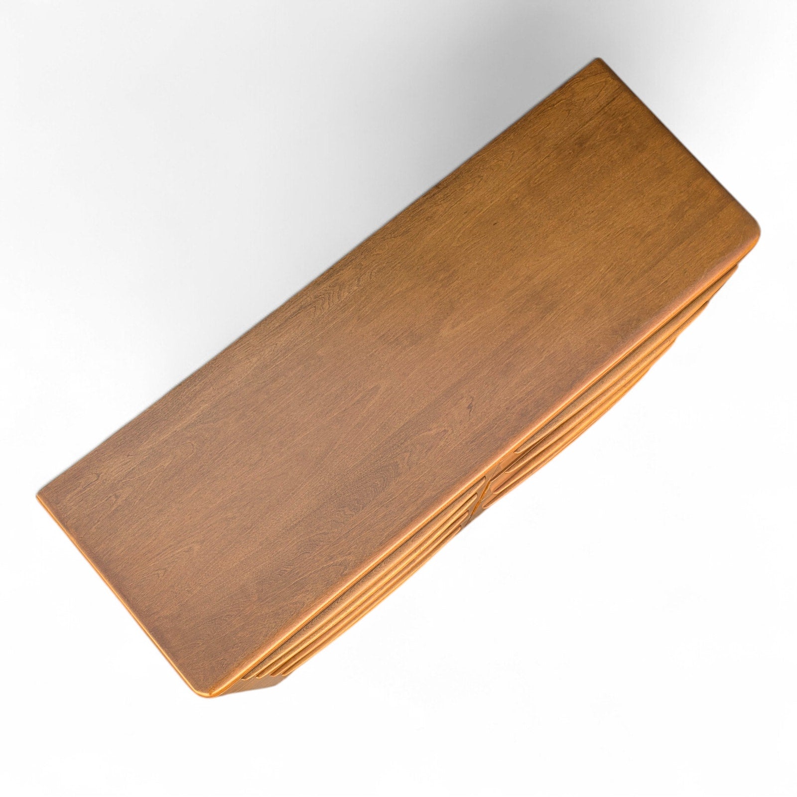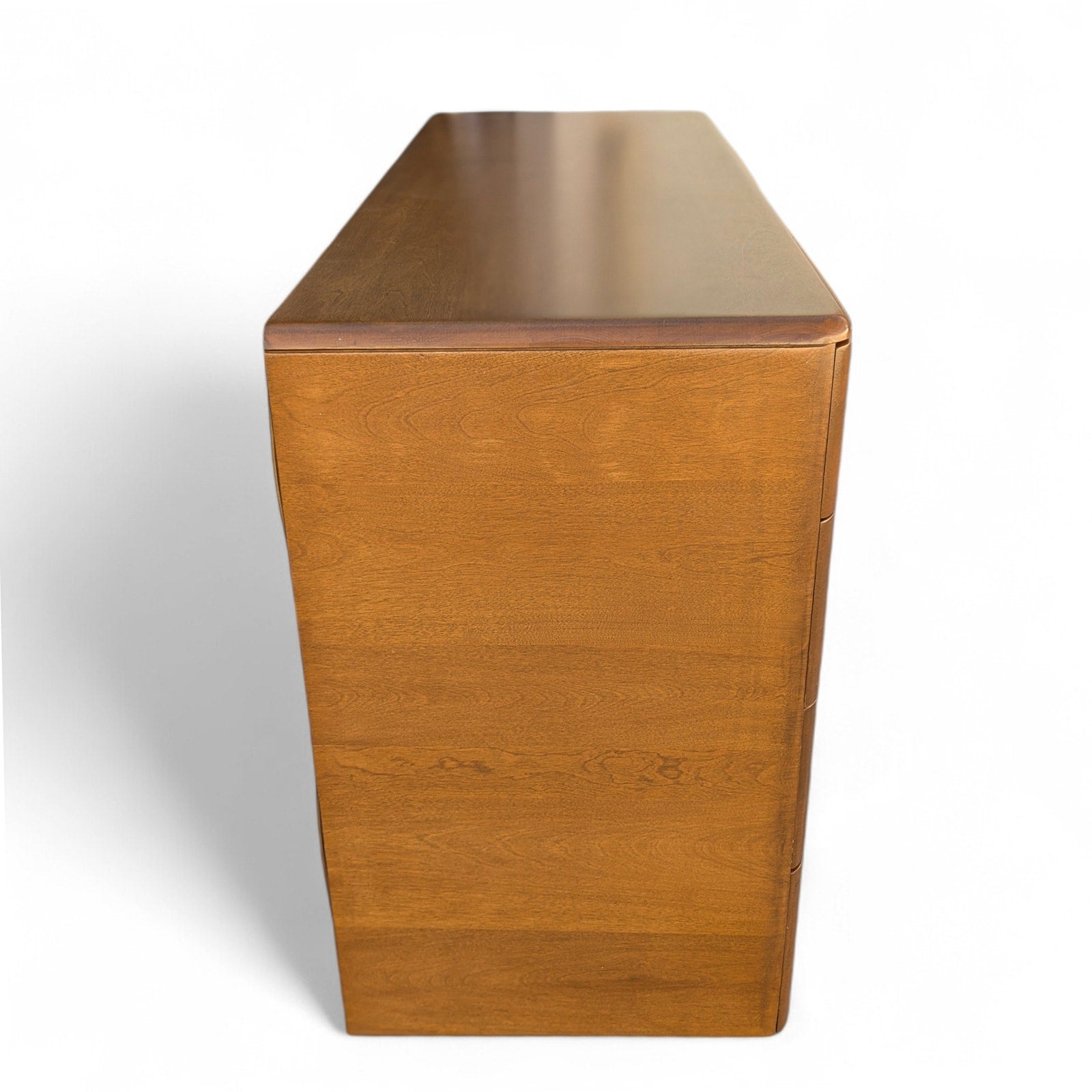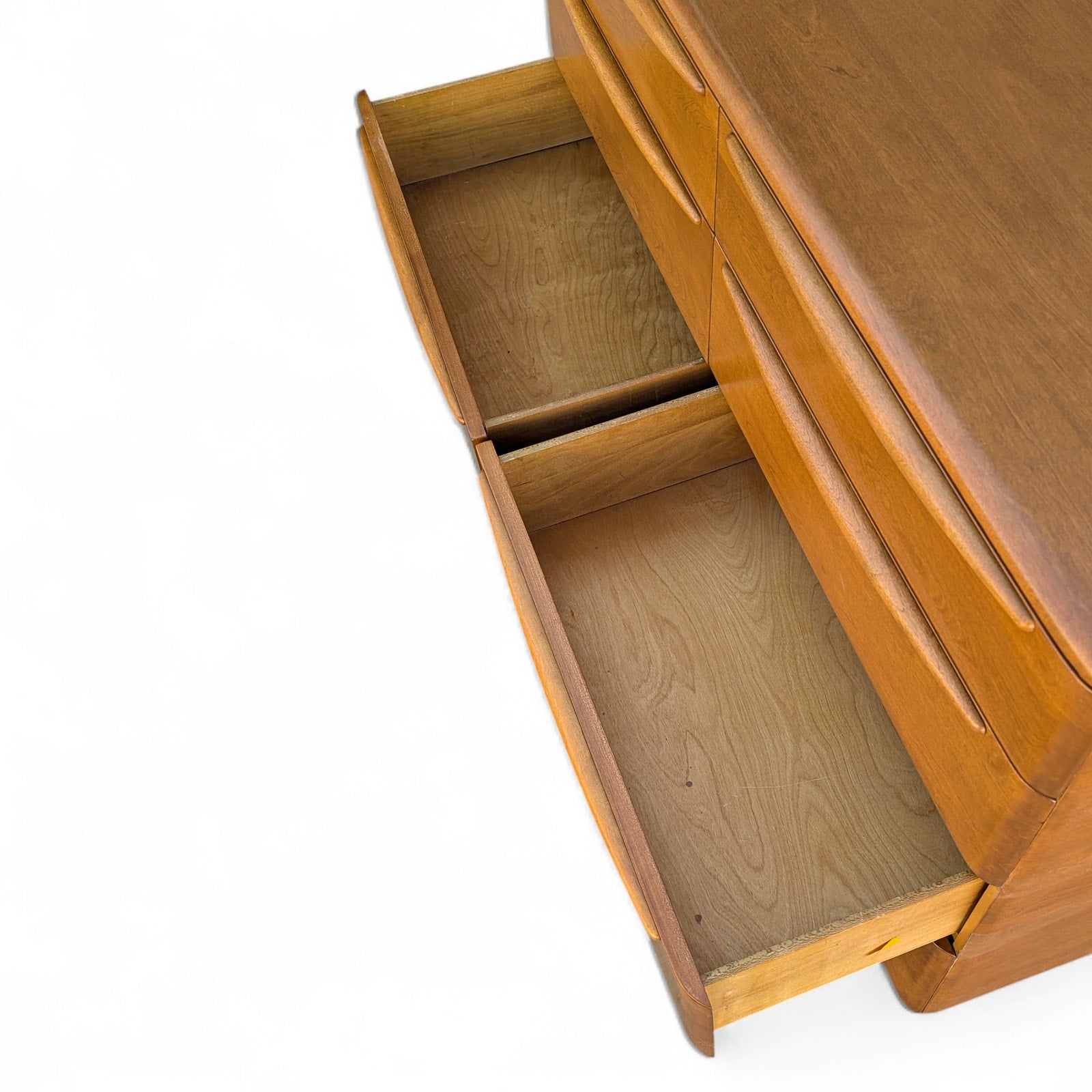 This Heywood-Wakefield mid-century modern lowboy dresser features eight spacious drawers and a streamlined silhouette. Crafted in solid wood with a warm honey-toned finish, the design showcases softly rounded edges and sculpted integrated pulls.