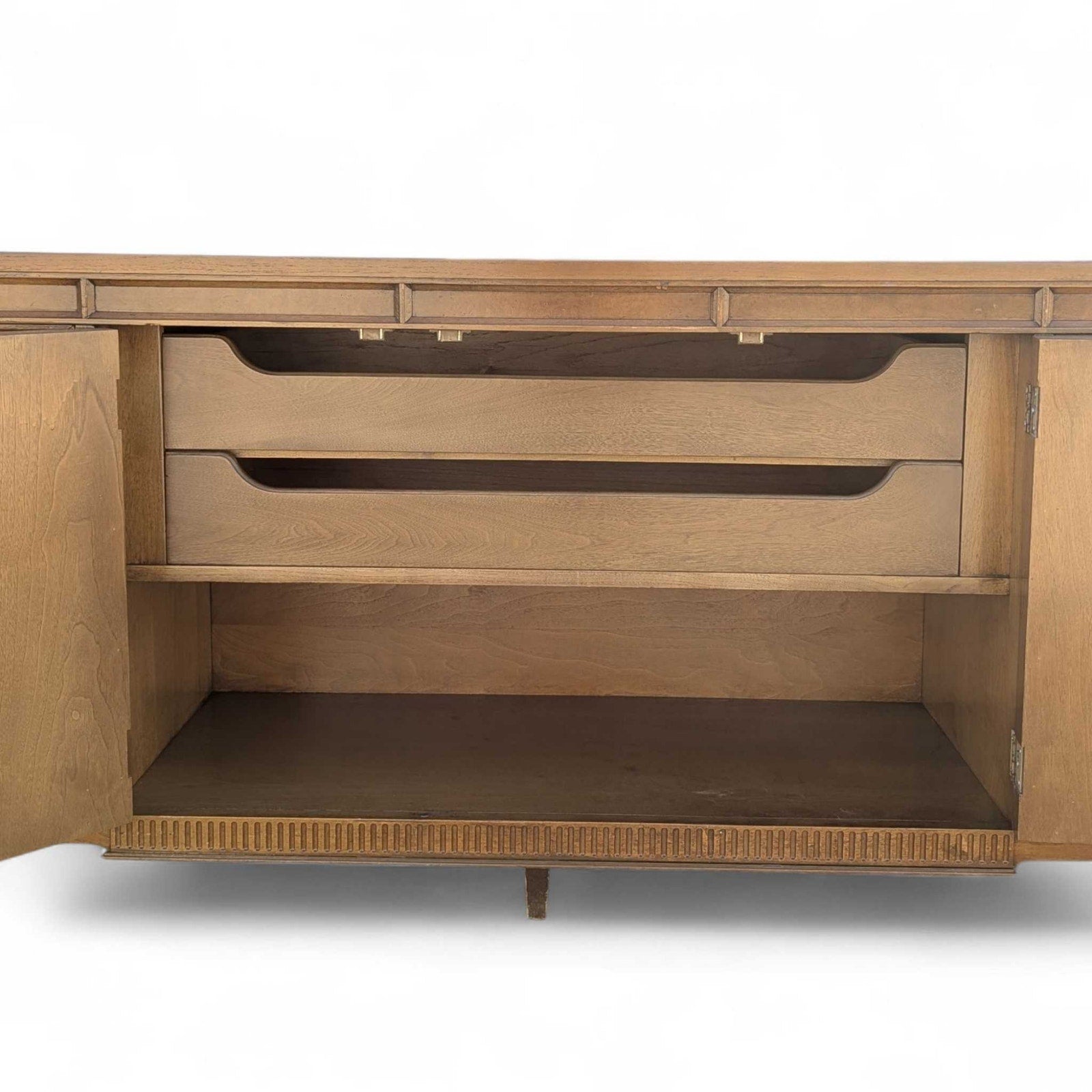 The sideboard features five paneled cabinet doors opening to spacious interior shelving and two central drawers—perfect for storing dinnerware, linens, or serveware. The right-hand door requires a slightly firmer pull but opens and closes properly. The top has been professionally refinished and includes a small corrected area that blends well with the overall surface.