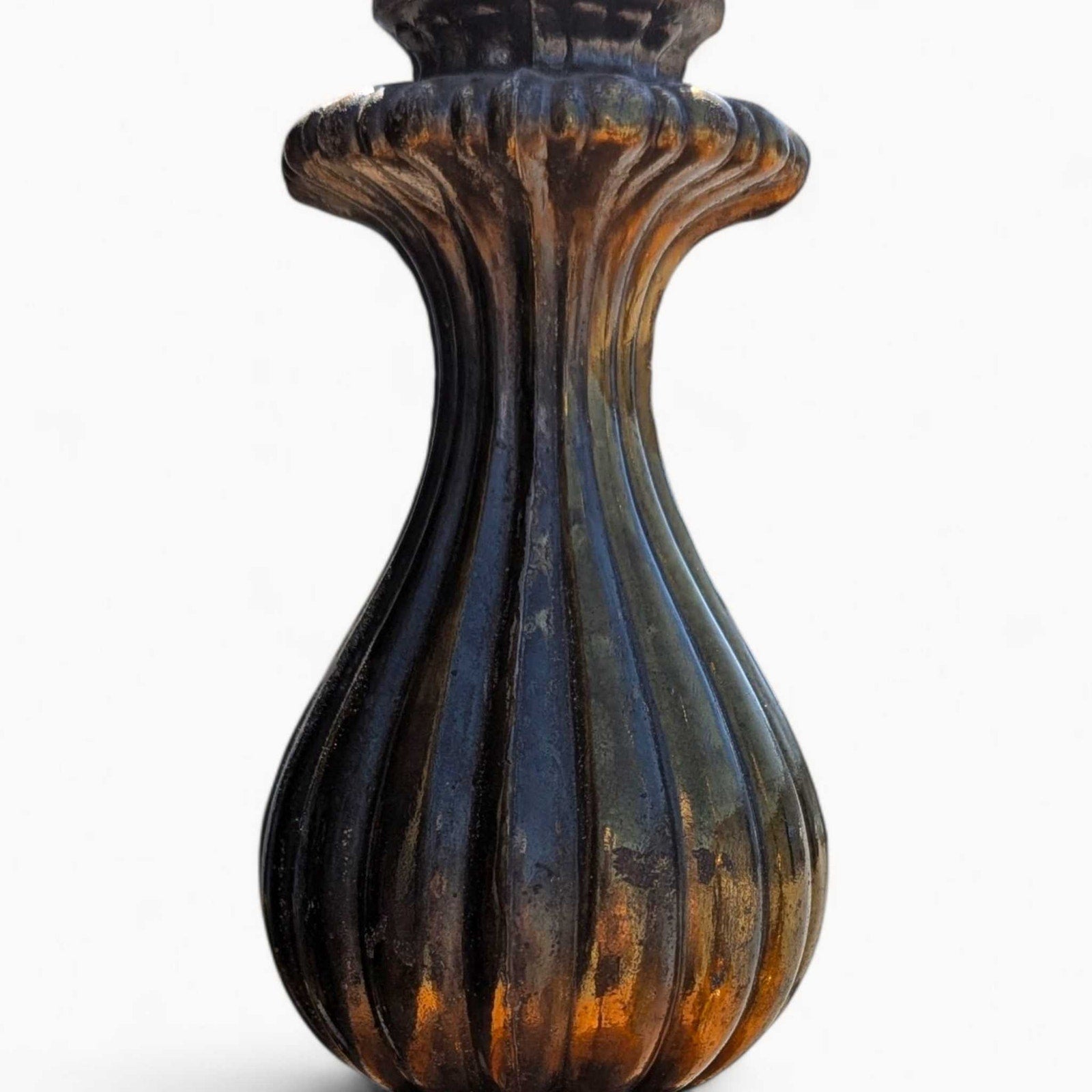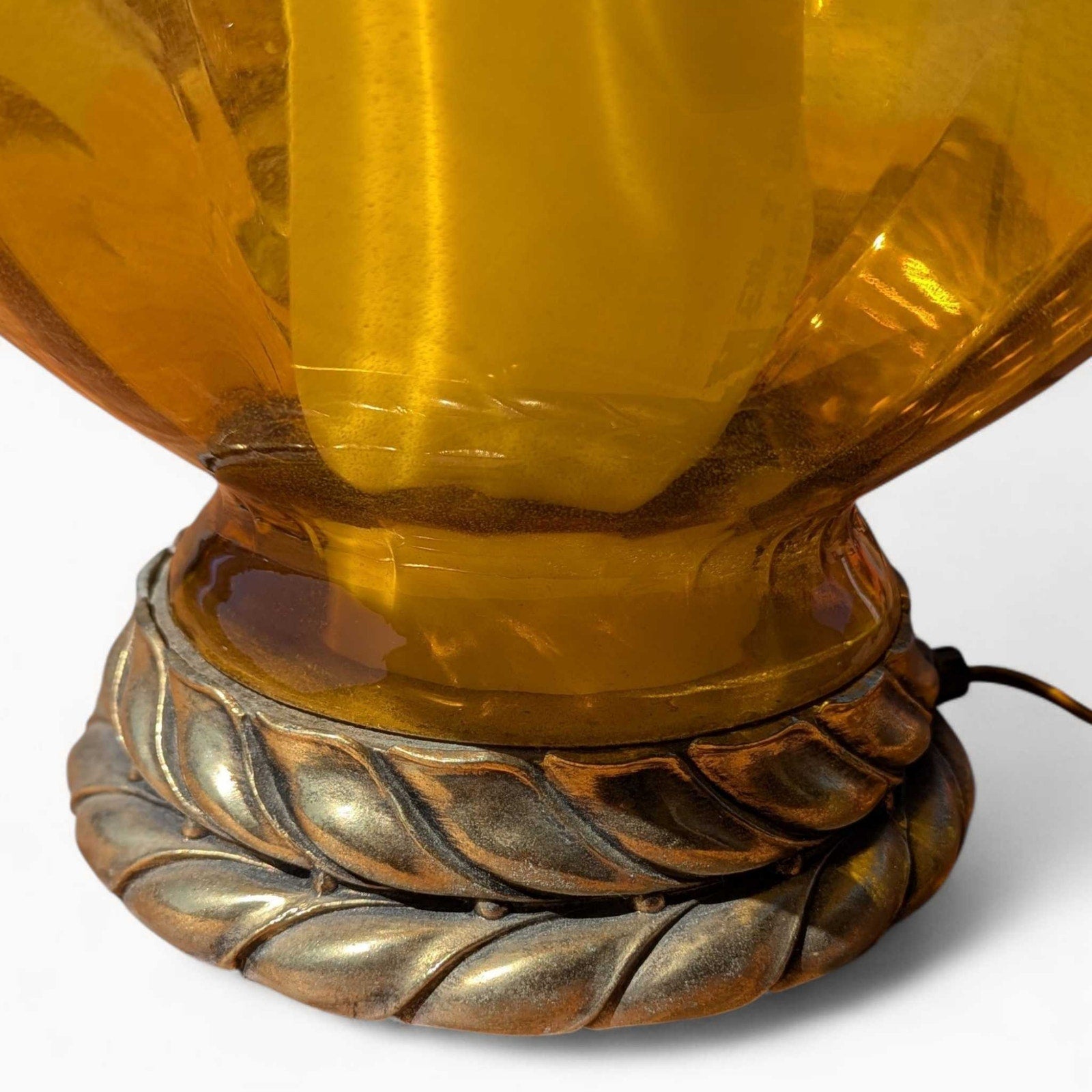 Striking pair of vintage amber glass table lamps with ornate brass-toned accents. These statement pieces blend Hollywood Regency flair with mid-century curves—perfect for eclectic interiors, warm-toned spaces, or vintage-inspired rooms.