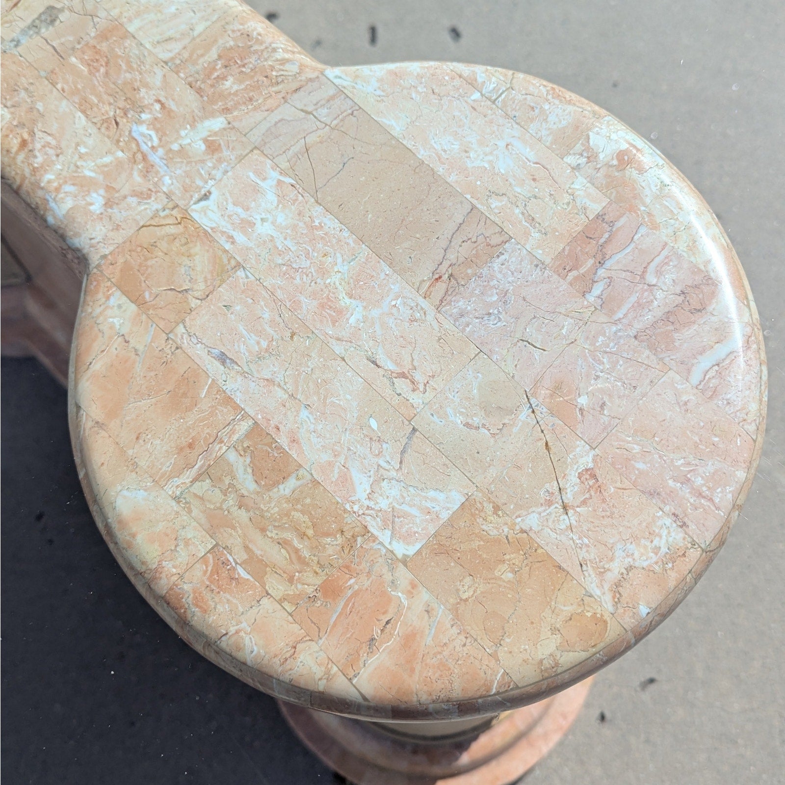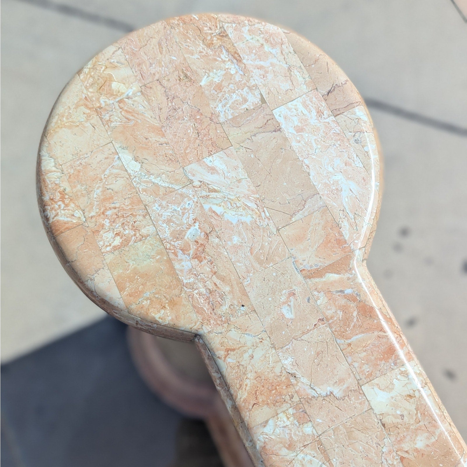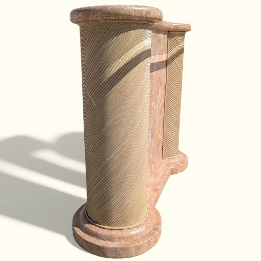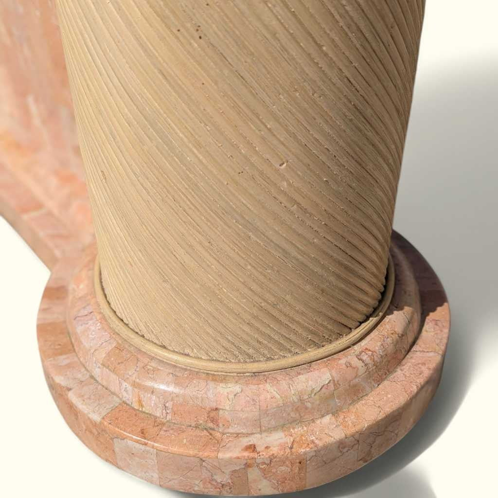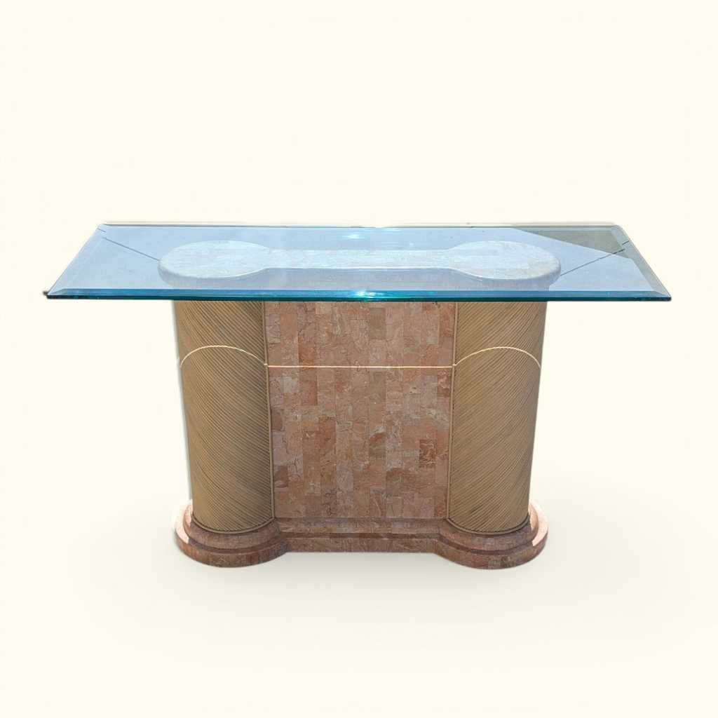 This stunning Postmodern Entryway Glass Console Table combines sleek modern design with a bold tesselated marble base. The glass top offers a light and airy feel, while the unique rattan columns create a strong visual contrast, adding an elegant touch to any entryway or living room. The design embodies the best of postmodern aesthetics, perfect for those seeking a statement piece that combines both function and style.