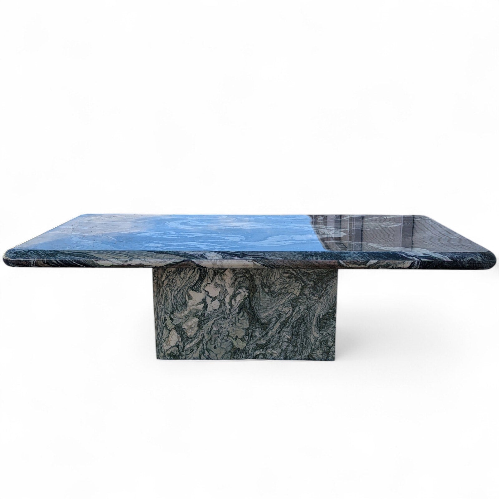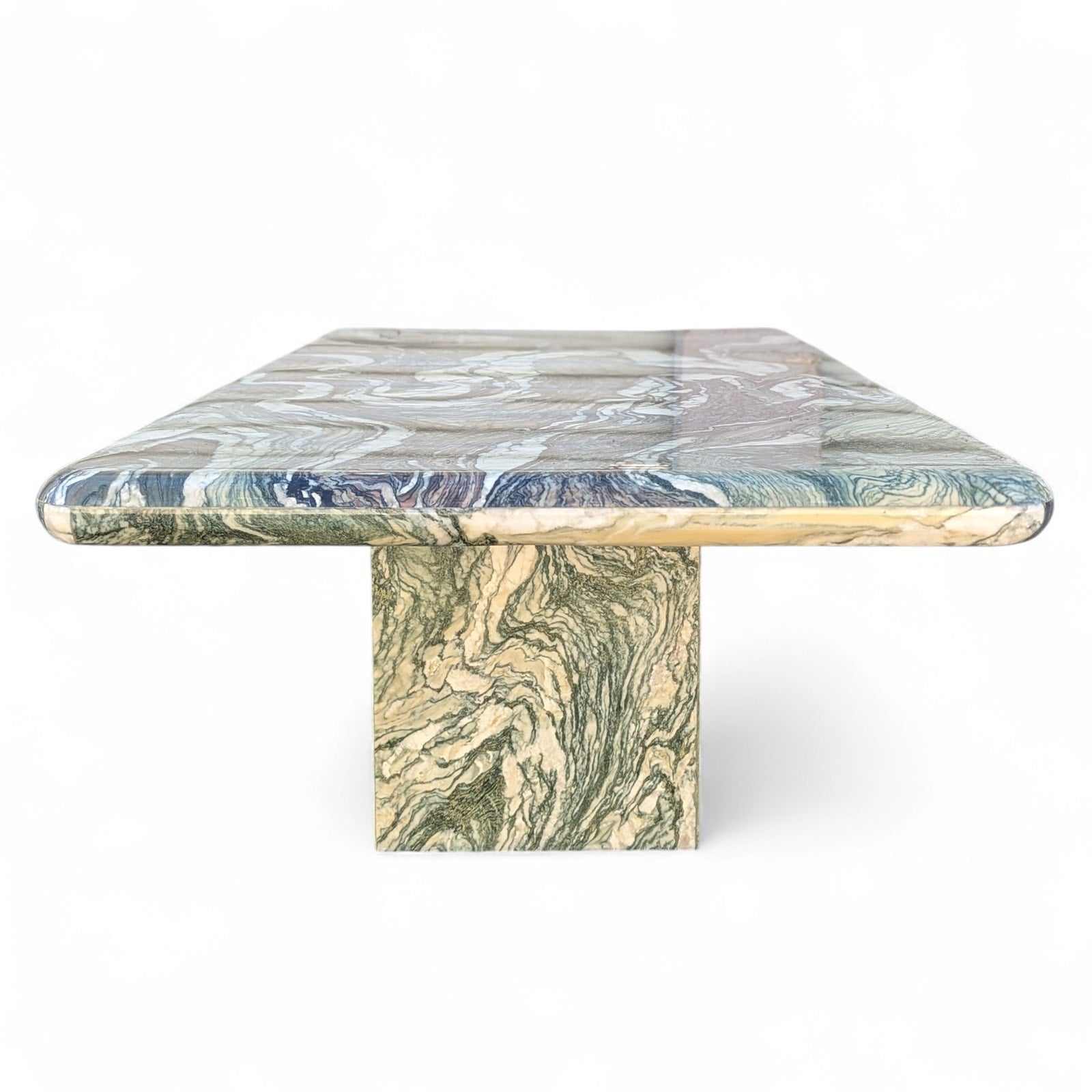 An architectural statement piece, this coffee table features a monolithic design crafted from richly figured green marble. The top features a soft bullnose edge and rests on a matching solid plinth base. Its organic veining creates a painterly effect that balances the table's heavy, geometric form.