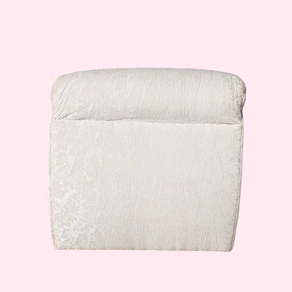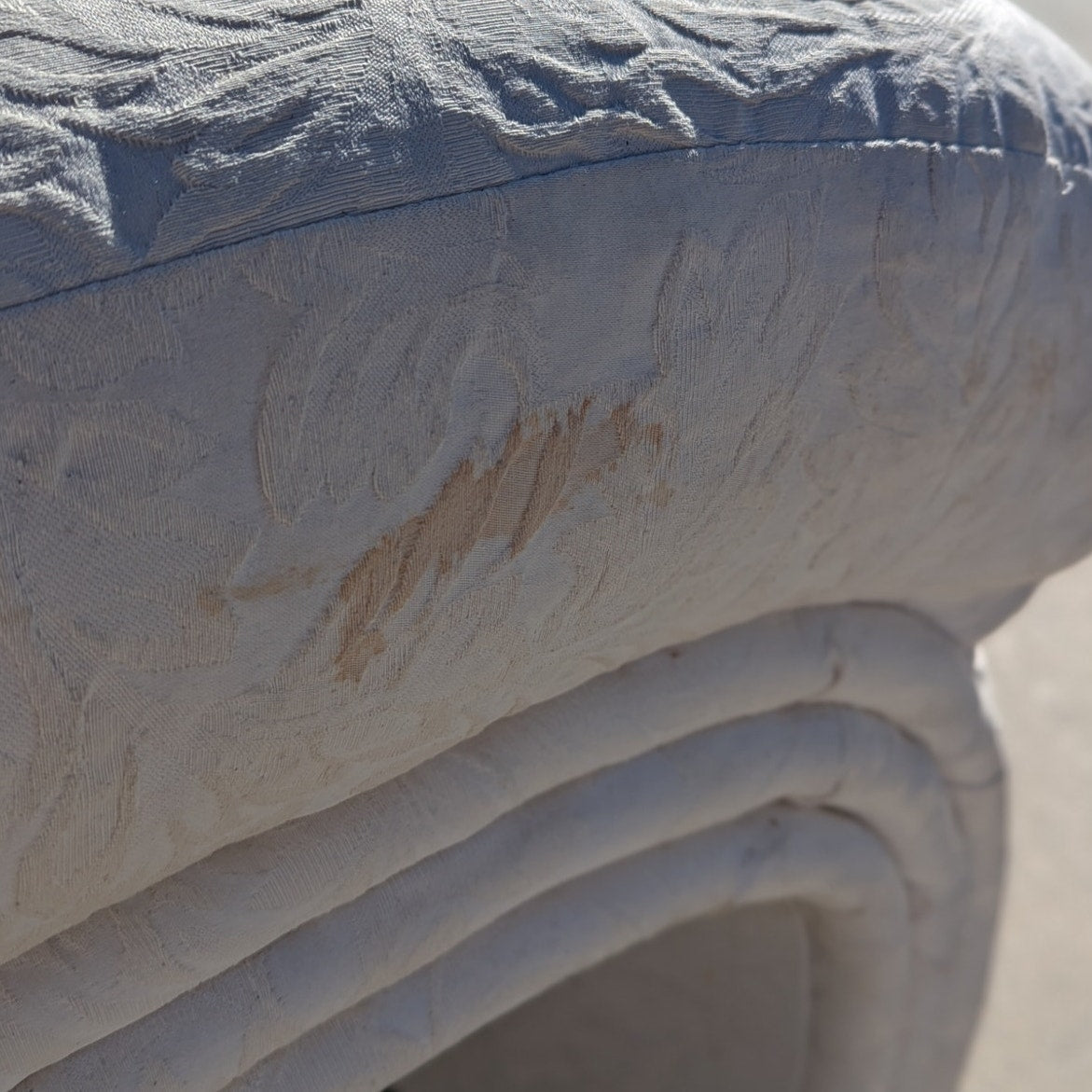This unique postmodern lounge chair features a bold, sculptural design with curving lines and floral, textured upholstery. Its distinct form is perfect for those looking to make a statement in any room. The organic shape, combined with its soft neutral fabric, makes this chair an ideal focal point for contemporary or retro-inspired interiors.