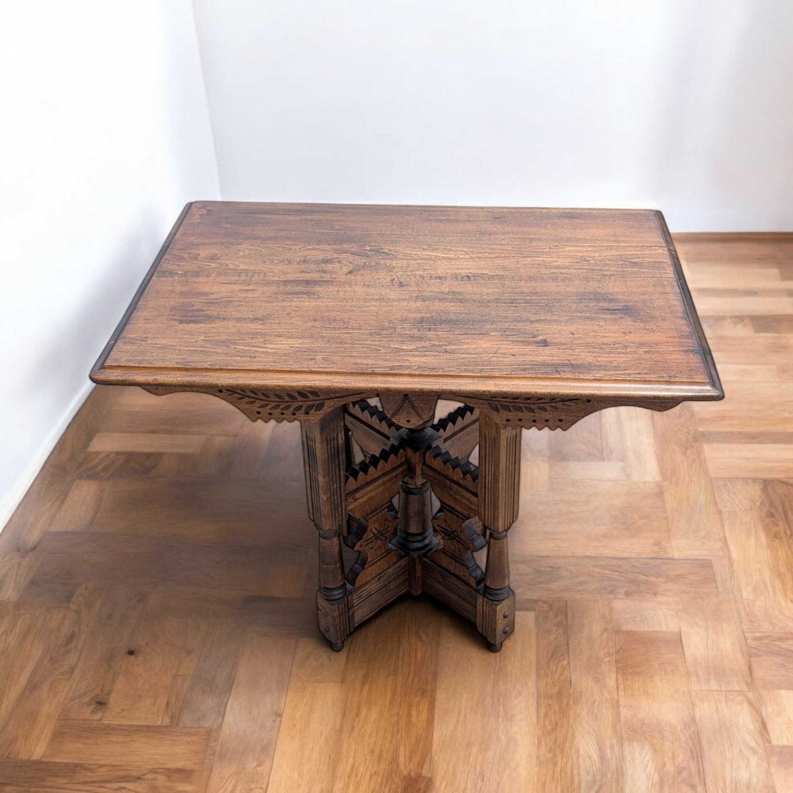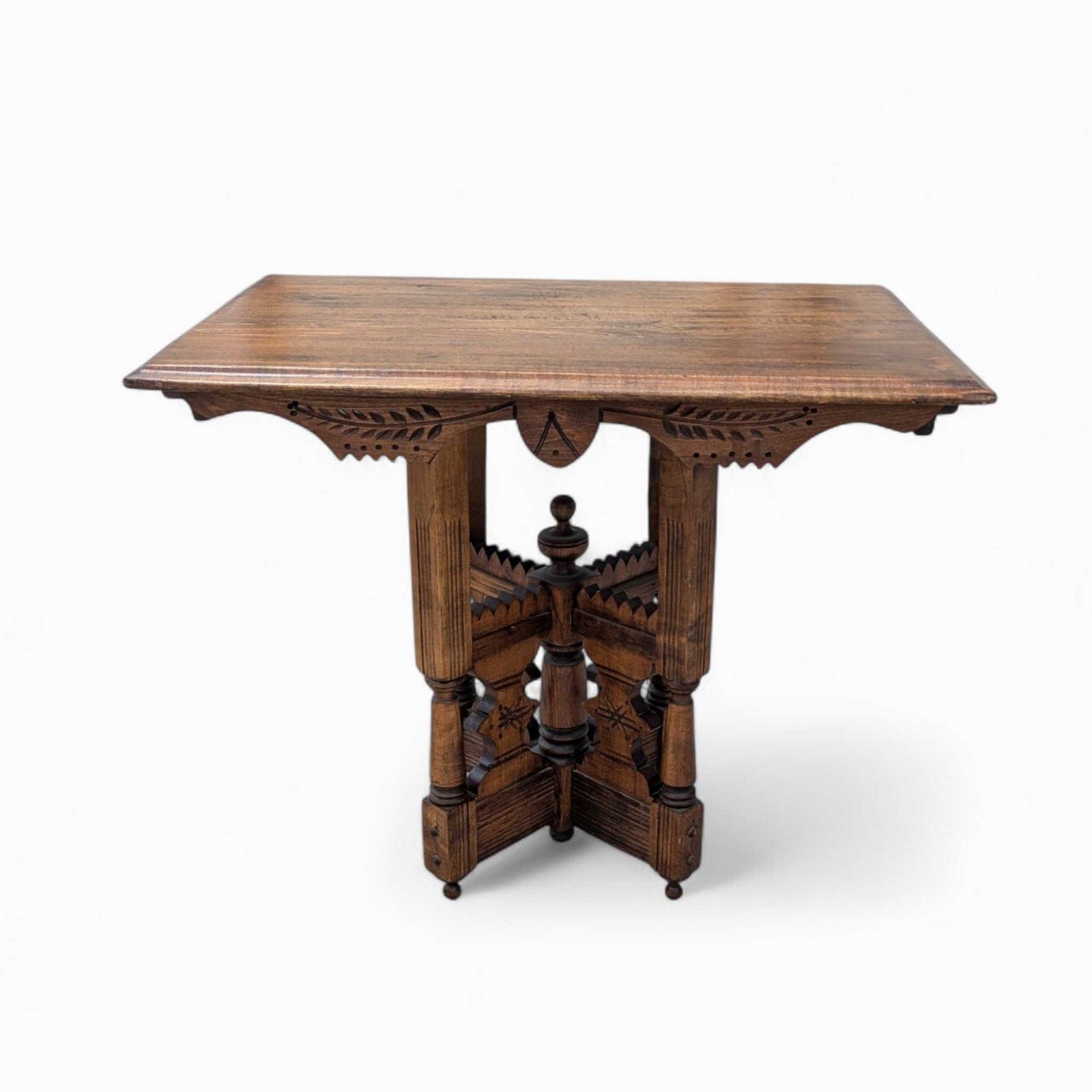 Charming antique Victorian-style side table with intricate woodwork and an ornate pedestal base. The hand-carved details are reminiscent of Eastlake design elements, with a symmetrical starburst motif and beautifully scalloped trim. Solid and sturdy, this piece works perfectly as an accent table, entryway piece, or a unique nightstand.